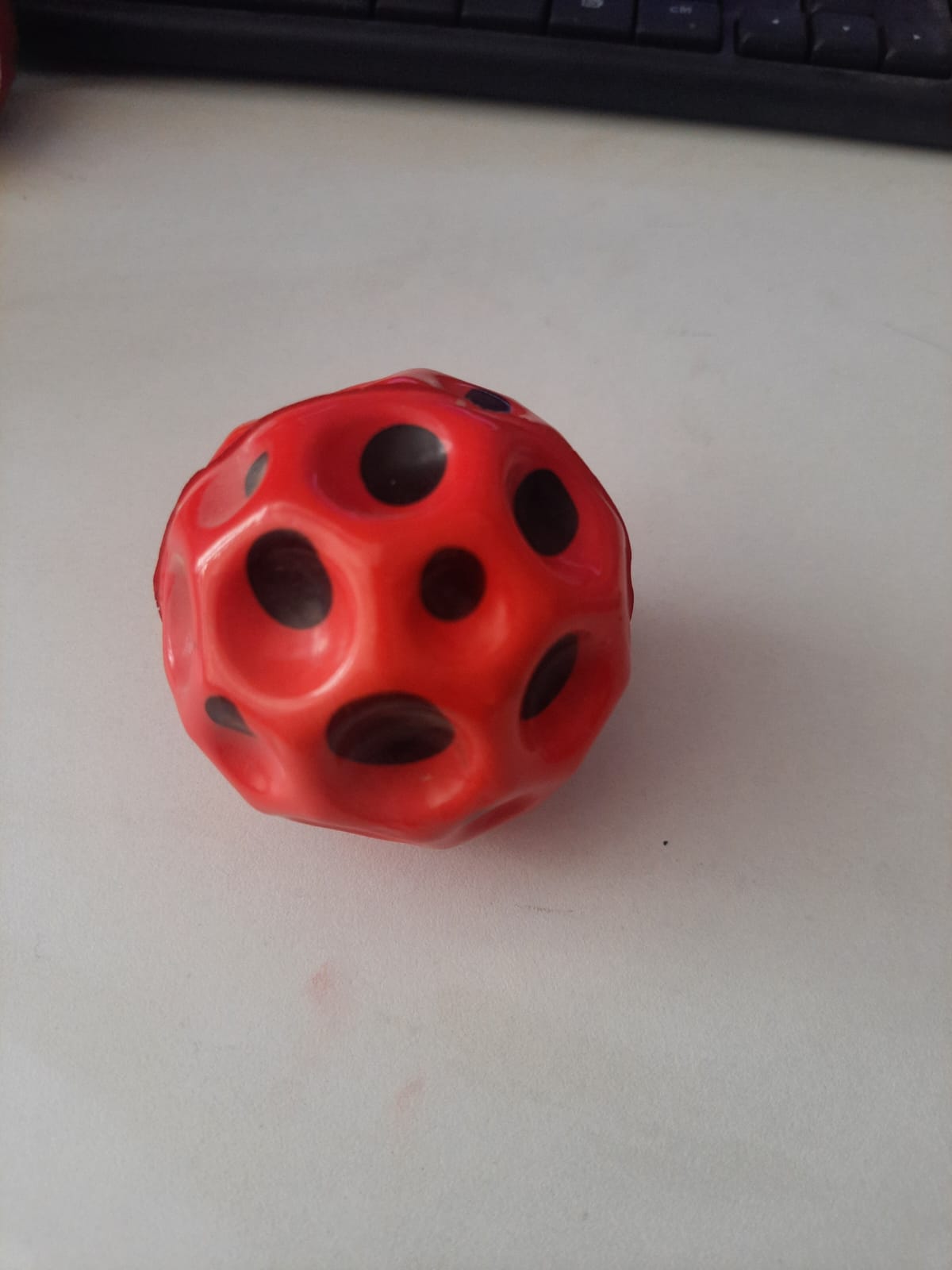 This is a red perforated ball š“, designed with multiple black circular holes all over its surface š³ļø. The ball has a textured, bumpy structure, making it look somewhat like a futuristic or toy-style version of a molecule or a geodesic shape š§¬. It's made of a shiny plastic or rubbery material, likely intended for pets š¶ or for interactive play with kids š§. The bold red color with black accents gives it a fun and eye-catching appearance šÆ. It's sitting on a smooth white surface near a keyboard āØļø.