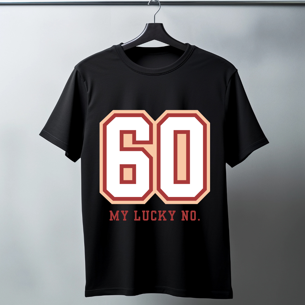 Celebrate the era of confidence and legacy with our "60 – My Lucky No." graphic tee. Designed for those who wear their age or lucky number with pride, this bold and stylish shirt features a striking varsity-style "60" on the front, accented in crisp white, warm peach, and deep red. The phrase "MY LUCKY NO." adds a personal, empowering touch that turns heads and starts conversations.