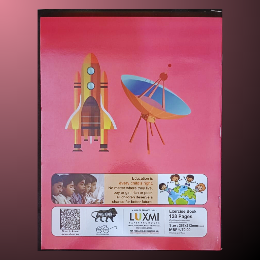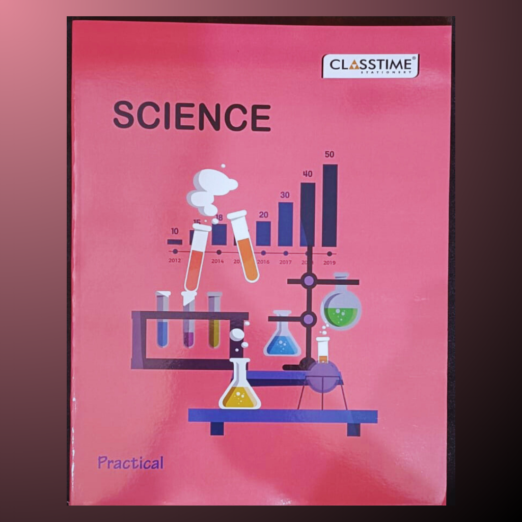This is a Classtime Science Practical Notebook, ideal for school laboratory work and science experiments. The notebook features a vibrant pink cover with science-themed illustrations, and includes dedicated sections for experiment documentation, a certificate of achievement, and an index of experiments performed. It contains 128 pages and comes in a convenient size of approximately 267 x 212 mm (16 size), providing ample space for notes and observations. Priced at an affordable ā¹70, this notebook is a practical and organized choice for students.