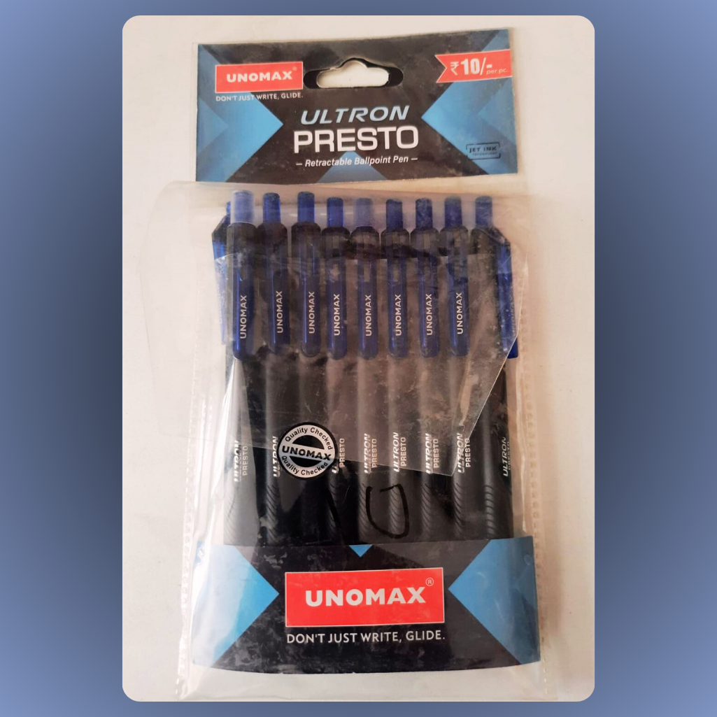 ποΈβ¨ The Unomax Ultron Presto Retractable Ballpoint Pen Set is a must-have for smooth and effortless writing! Priced at just βΉ100 for a set of 10 pens, each pen is worth βΉ10 and delivers glide-like performance with precision. ποΈπΌ With a sleek black body, firm grip, and reliable blue ink, these pens are perfect for students, professionals, and everyday use. The click-to-write mechanism ensures convenience and no cap hassles! βοΈπ