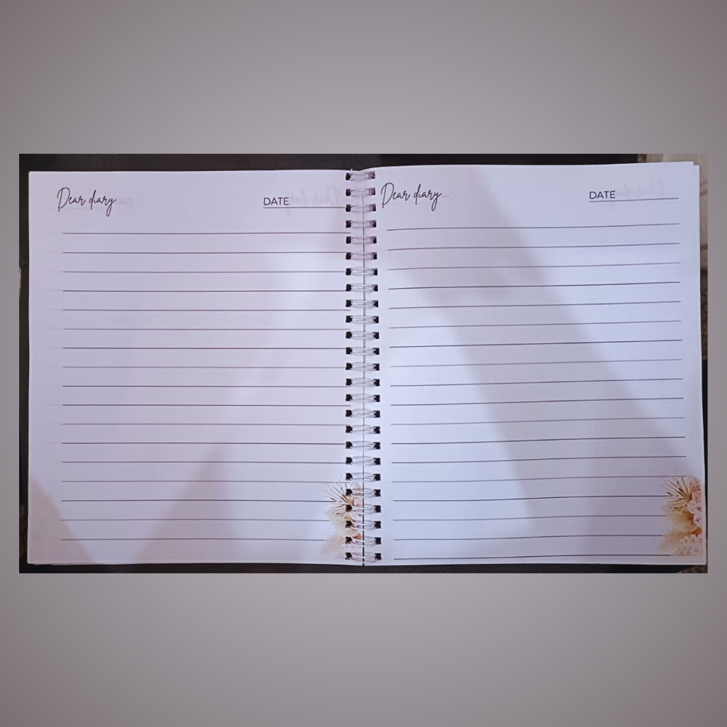 This handmade diary by ColorsLover features a charming floral cover design with a clean and elegant interior layout titled "Dear diary" on each page. Compact and practical, it is slightly smaller than A4 size, making it easy to carry and perfect for daily journaling. The spiral binding allows for easy flipping, and the inner pages include space for dates and lined sections for neat writing. Priced affordably at just ₹140, this diary combines aesthetics with functionality—ideal for personal reflections or thoughtful gifting.