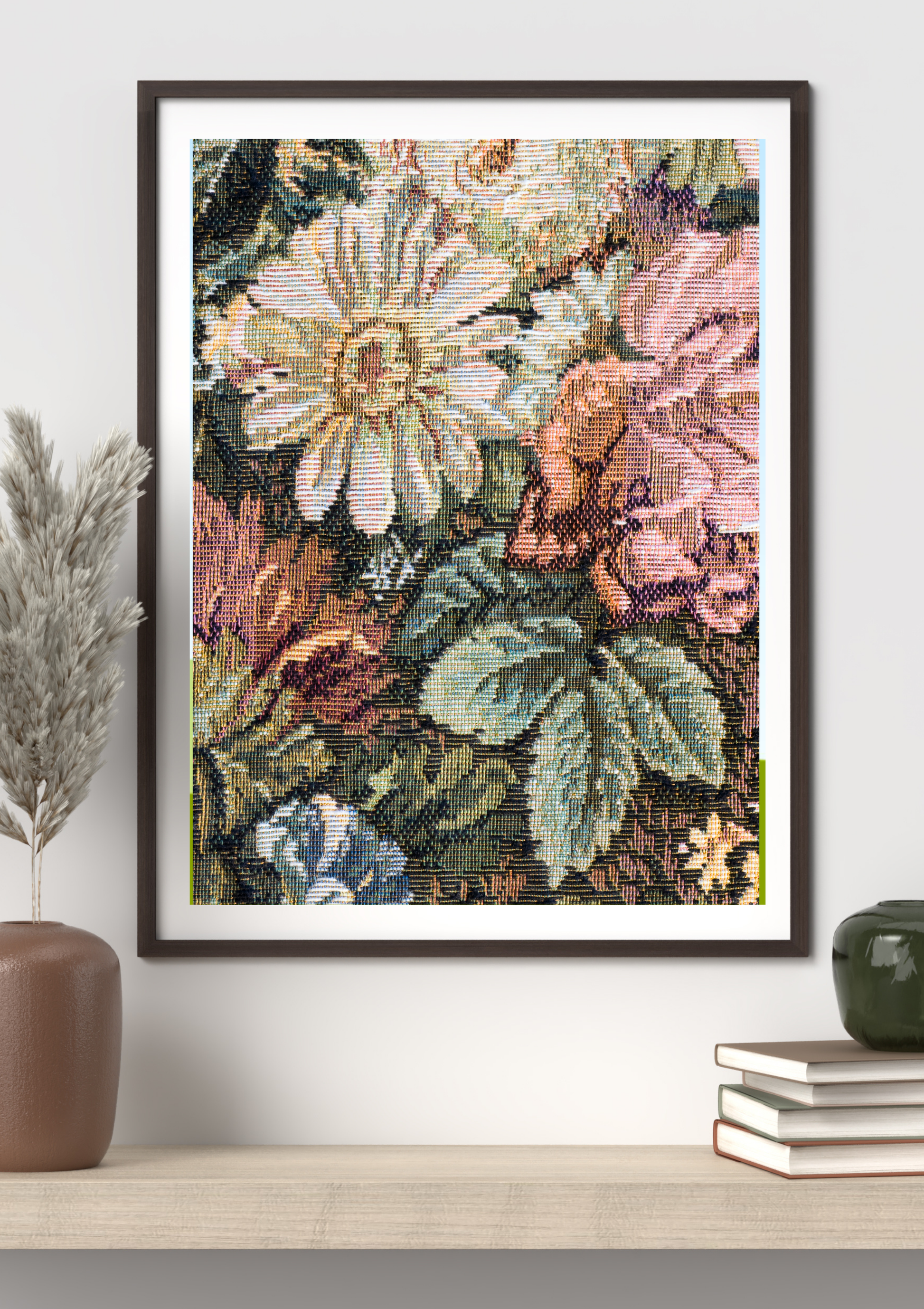 Add a touch of timeless charm with this A4-sized Vintage Floral Tapestry Art. Featuring intricately woven flowers in rich, vibrant tones, it's beautifully framed in a dark wood finish with a clean white mat.