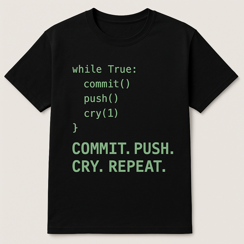 For every developer stuck in an infinite loop of debugging, committing, pushing, and silently weeping โ this oneโs for you. The "while tru: commit push and cry" T-shirt captures the real, raw emotions of late-night coding sessions and never-ending sprints. Itโs relatable. Itโs tragic. Itโs hilarious.