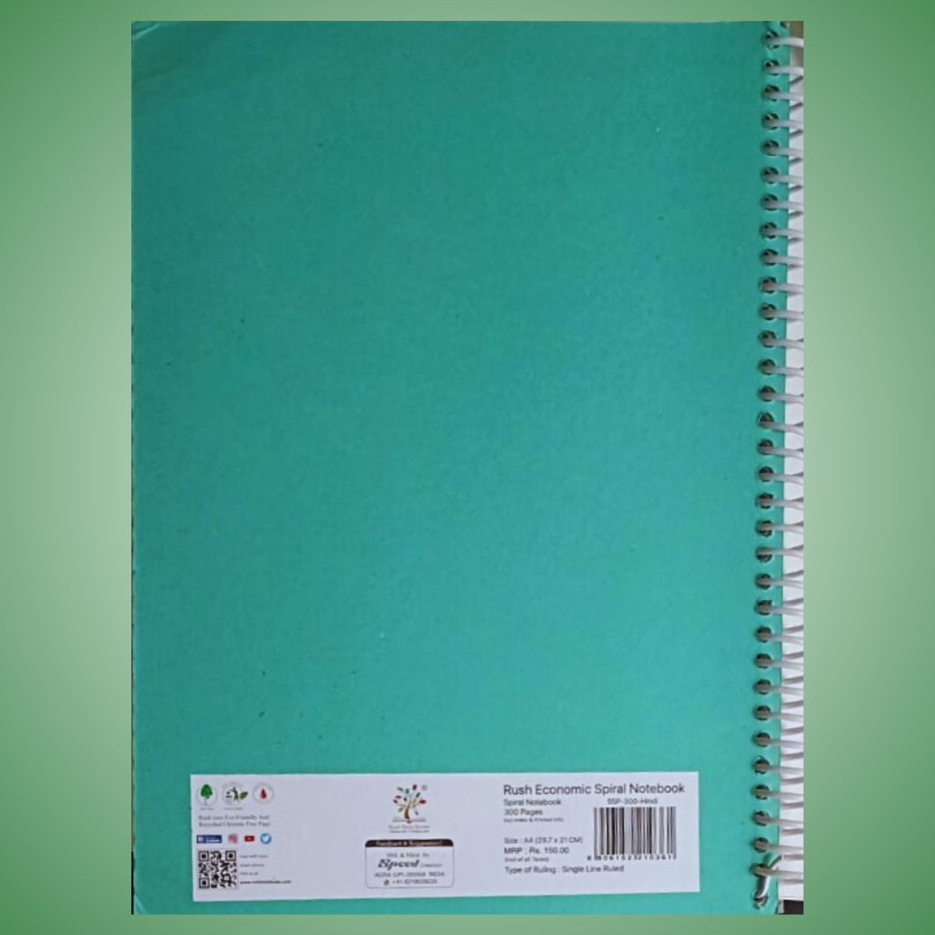 The Rush Economic Spiral Notebook is a practical and eco-friendly A4-sized notebook, measuring approximately 21 x 29.7 cm. It contains 300 single line ruled pages, making it ideal for students and professionals who need ample space for organized note-taking. The notebook features a sturdy spiral binding for smooth page turning and a flat writing surface. Its front cover has an eye-catching, colorful design, while the back cover is a simple green with product details. Each page includes space for the page number and date. Priced at ā¹150.00, this notebook offers great value for everyday use.