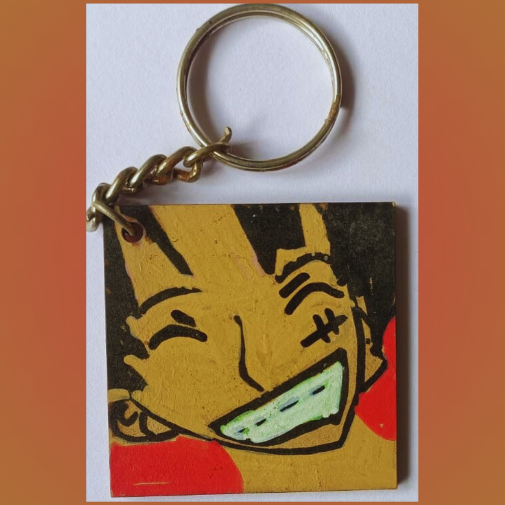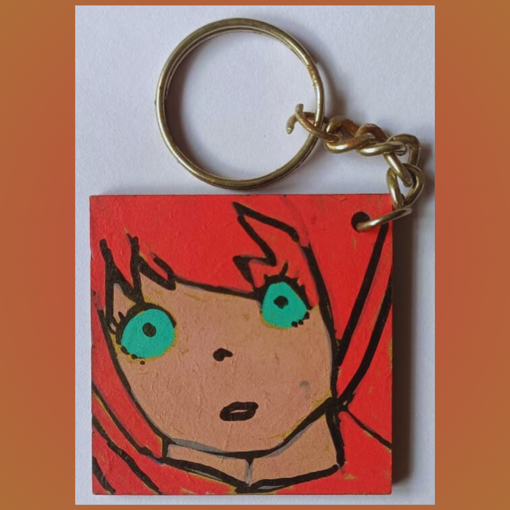This unique square wooden keychain features vibrant hand-painted artwork on both sides. One side showcases a stylized cartoon face with wide green eyes and expressive features, set against a bold pink background. The reverse side displays a cheerful face with a wide grin, highlighted by playful lines and vivid color contrasts. Lightweight yet sturdy, this eye-catching keychain is perfect for adding a touch of artistic flair to your keys, bag, or gift. Ideal for fans of quirky, handmade designs.