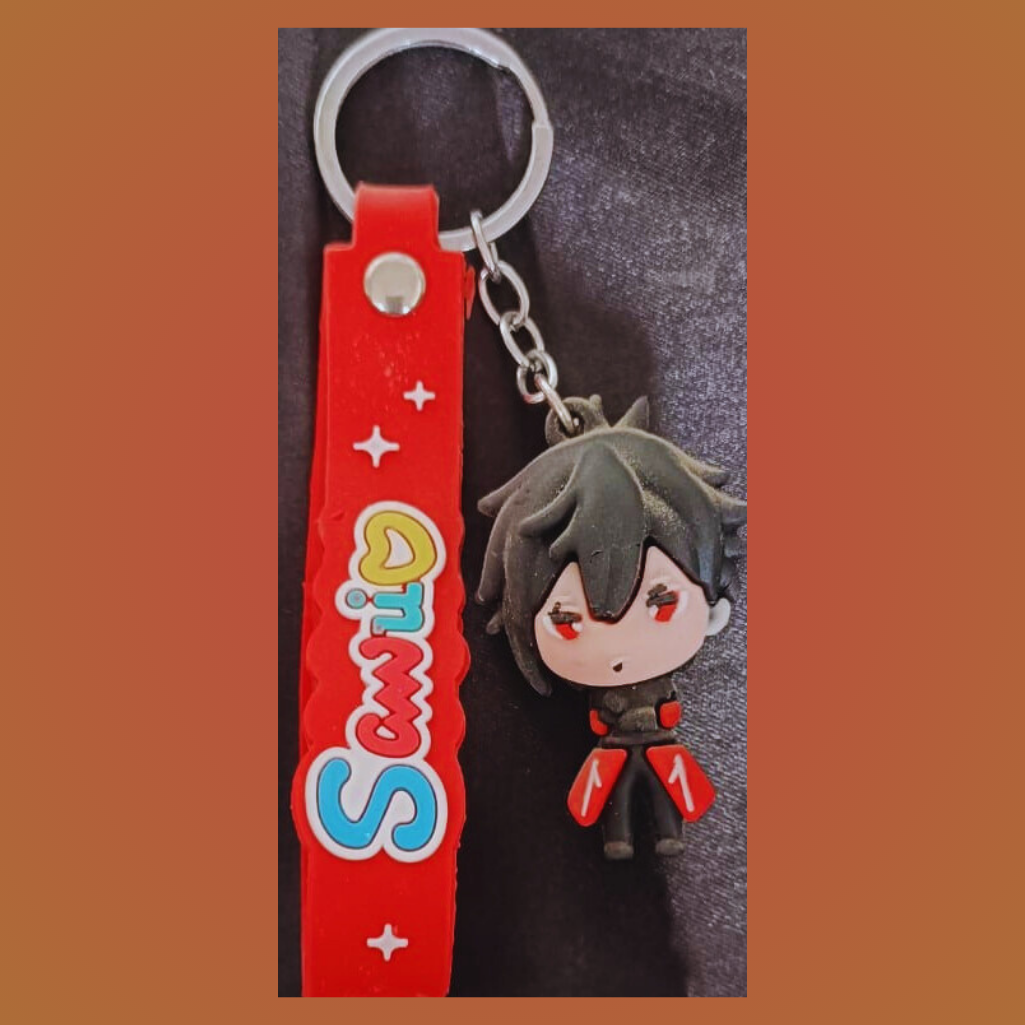 This eye-catching red rubber keychain features a chibi-style anime character with dark spiky hair and intense red eyes, giving off a cool and edgy vibe. Attached to a soft, flexible strap that reads “Savio” in colorful, playful lettering with star accents, this keychain combines cute and bold elements—perfect for anime fans or anyone who loves vibrant accessories with personality.