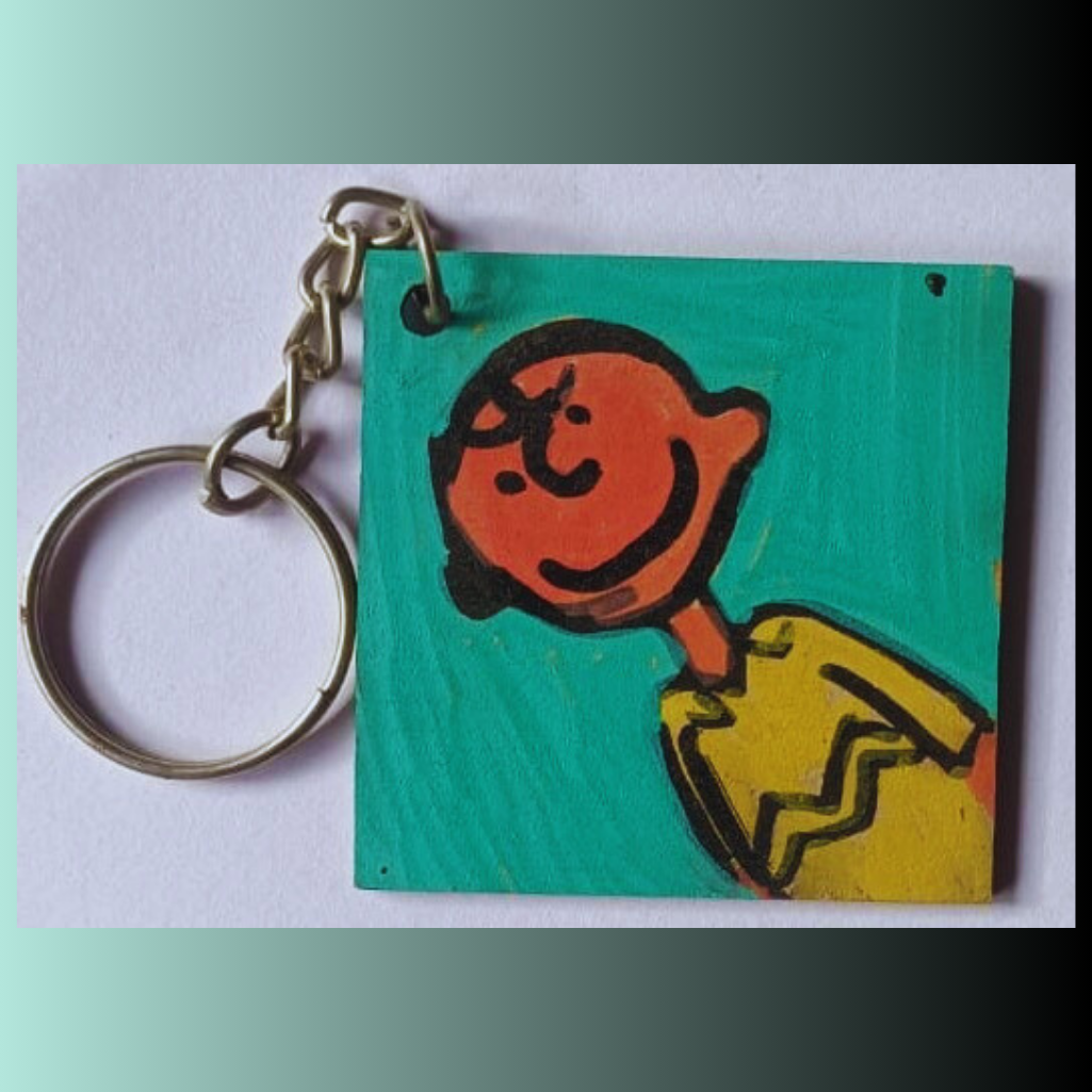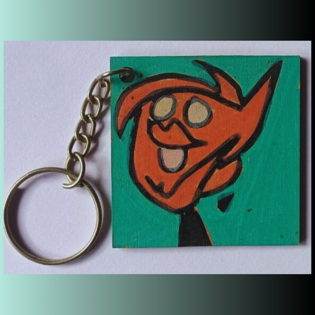 This quirky square-shaped wooden key chain features vibrant hand-painted artwork on both sides. One side showcases a cheerful, cartoonish character with a big smile and zigzag shirt, while the reverse side displays a wild, exaggerated face with tongue out and wide eyes. The bold turquoise background and expressive illustrations make it a fun, eye-catching accessory for fans of unique, handmade items. Sturdy metal ring and chain included for secure attachment.