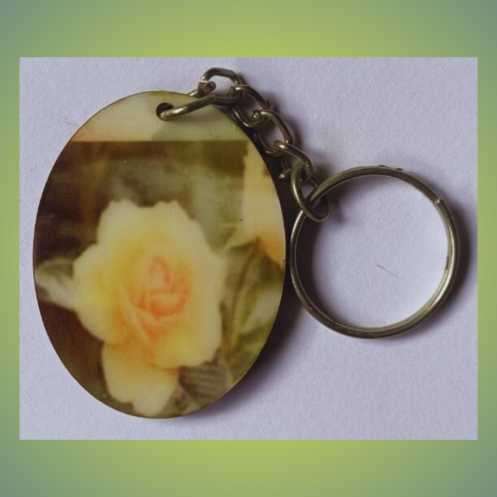 This keychain features an oval polymer tag with a softly blurred image of a yellow rose, giving it a warm, vintage charm. The floral design adds a delicate touch, while the sturdy metal chain and ring make it both decorative and functional—perfect for everyday use or as a sentimental keepsake.