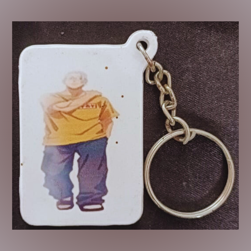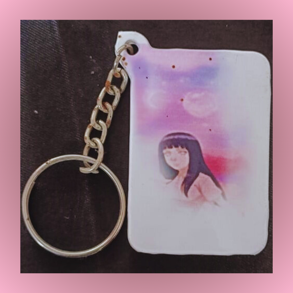 This double-sided rectangular keychain features two animated characters—one side shows a cool, casual figure in a yellow shirt and jeans, while the other side displays a soft, dreamy image of a girl with long black hair against a pastel sky. Made of durable polymer with a metal ring and chain, it’s a fun and stylish accessory for fans of animated art.