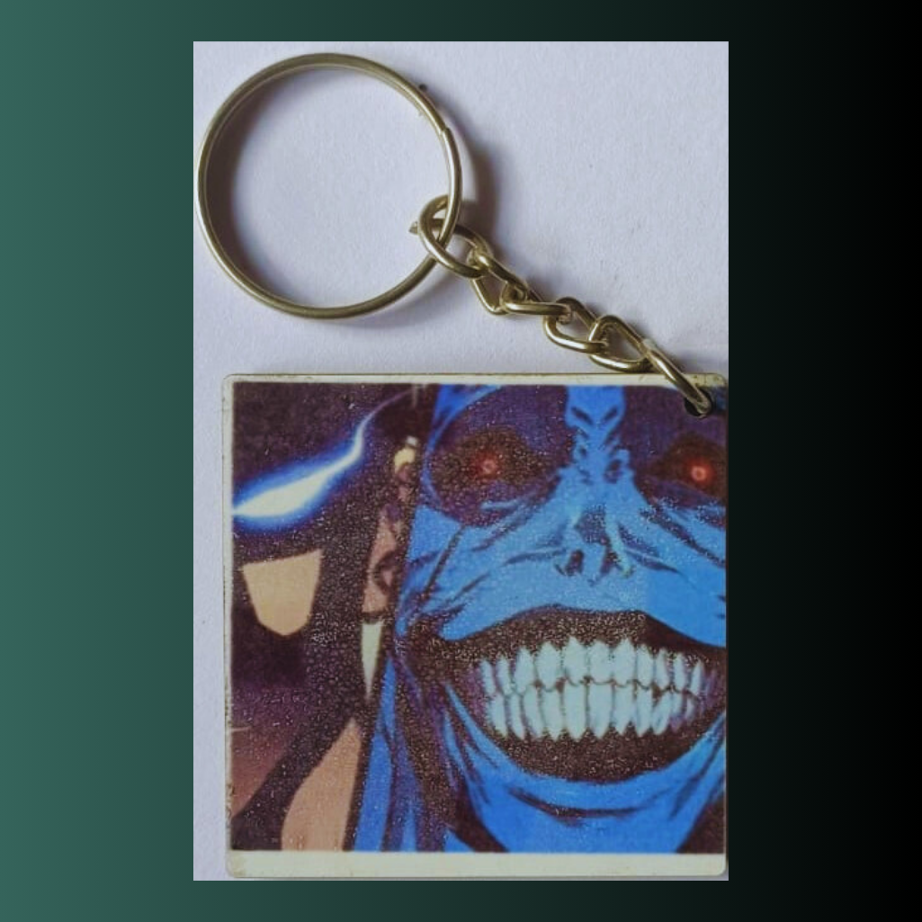 This bold square keychain features a striking, intense close-up of a blue, grinning comic-style character with glowing red eyes. Made from durable polymer and fitted with a metal chain and key ring, it's a standout accessory for fans of edgy or dark-themed artwork.