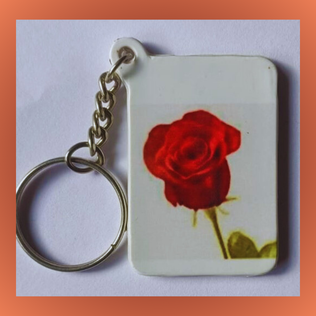 This charming rectangular keychain features a vivid red rose printed on a white background, symbolizing love and elegance. Made from durable polymer and paired with a sturdy metal chain, it's a perfect accessory for romantics or flower lovers.