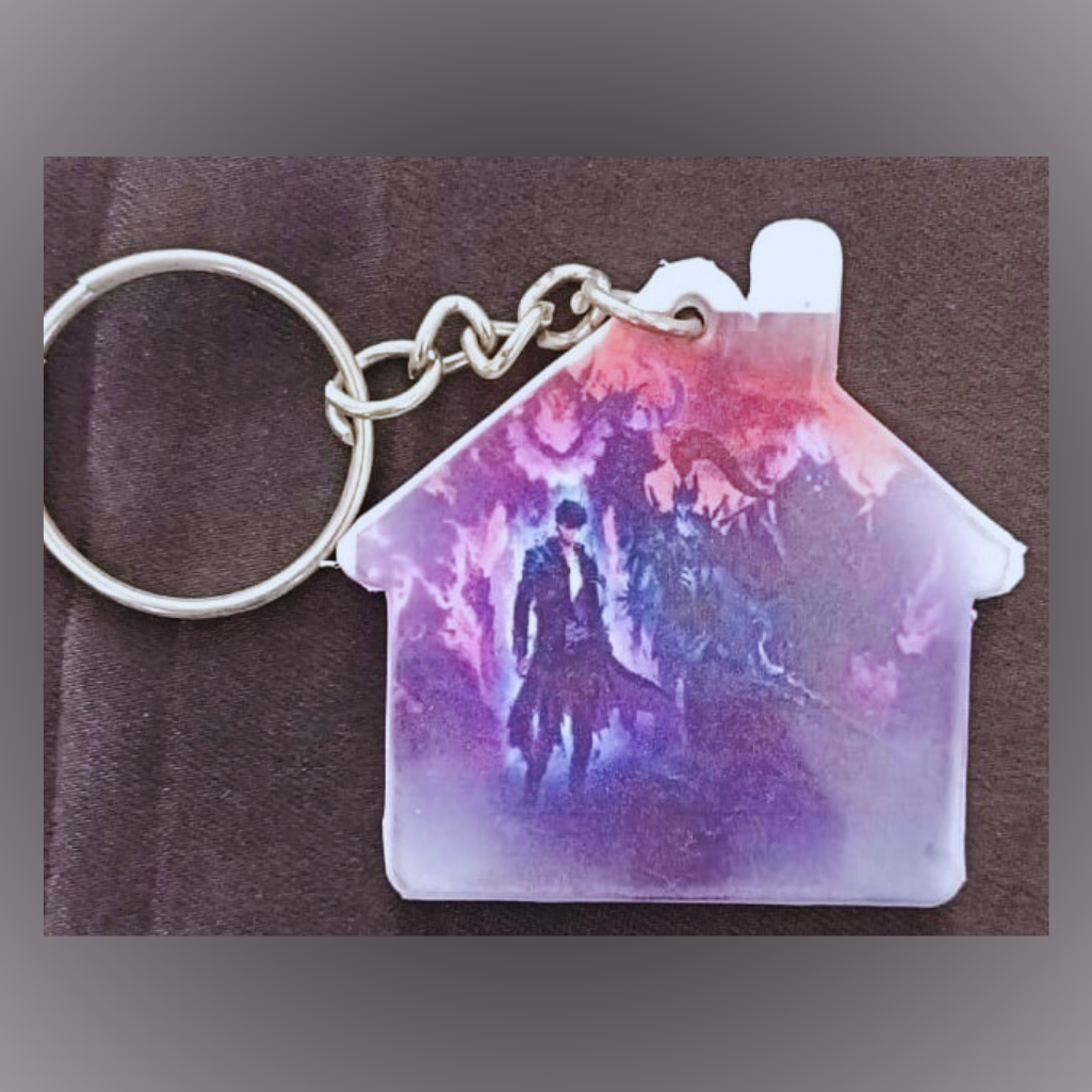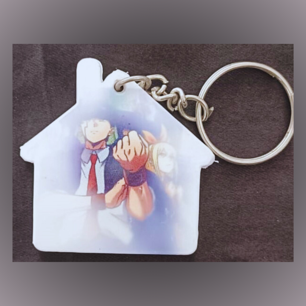 This house-shaped polymer keychain features vibrant, anime-inspired artwork on both sides. One side displays a mysterious, shadowy figure set against a dramatic, fantasy-themed background, while the other showcases bold anime characters in striking poses. Crafted from durable polymer, it’s a lightweight and eye-catching accessory—perfect for anime fans who want to keep their favorite characters close at hand.