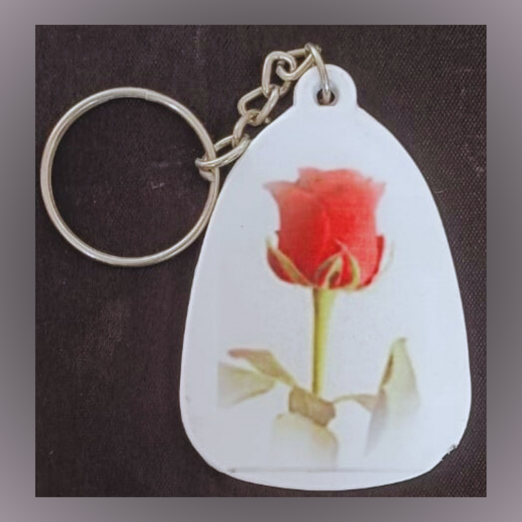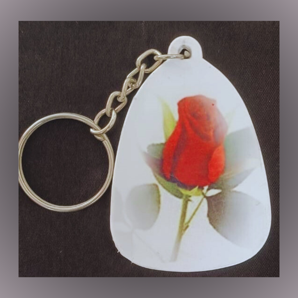 A beautifully crafted oval-shaped polymer keychain featuring vibrant red rose artwork on both sides. One side displays a delicate, upright rosebud, while the other showcases a fuller bloom with surrounding green leaves. Durable and lightweight, itโs a charming accessory symbolizing love and elegance. Perfect for keys, bags, or gifting.