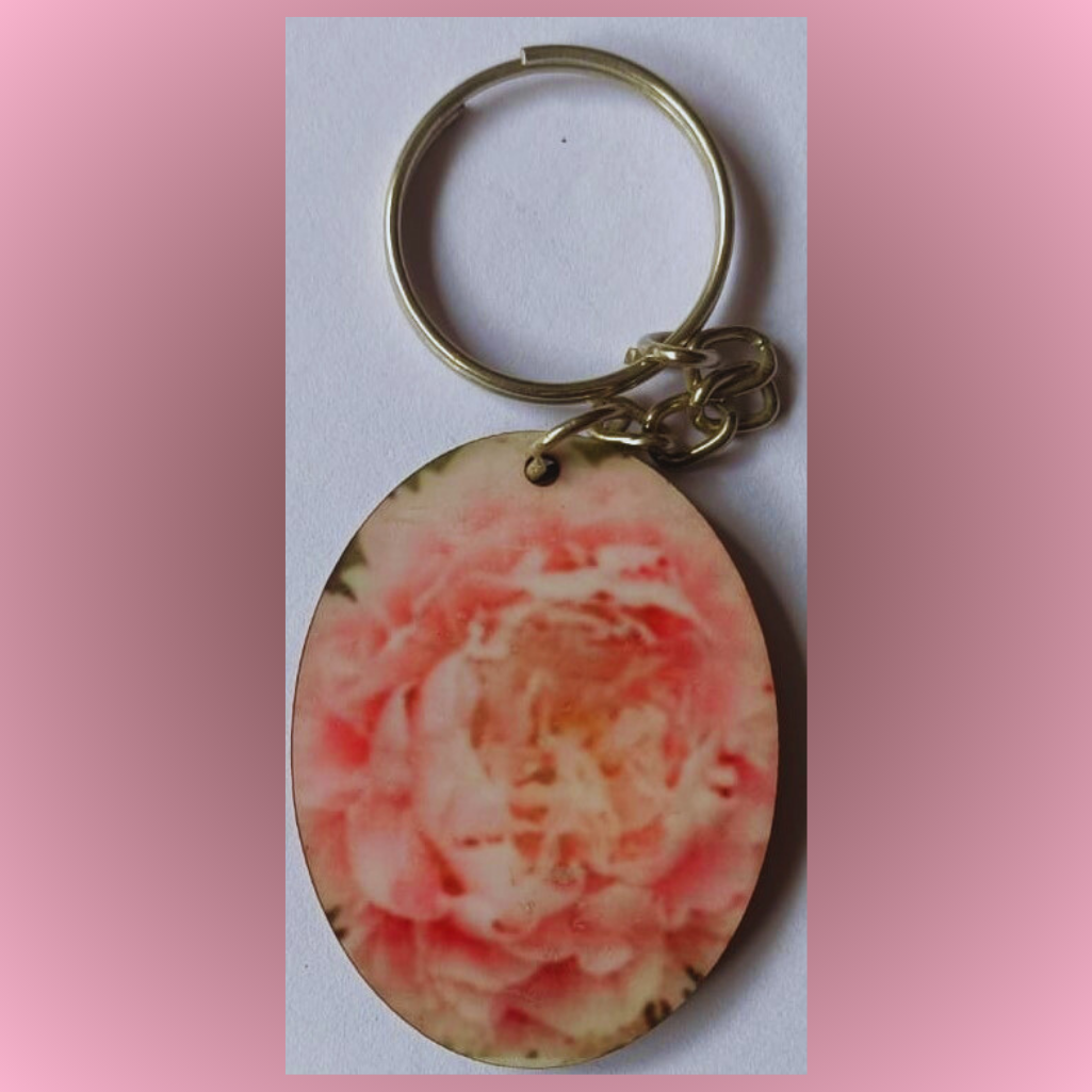 This charming oval-shaped polymer keychain features a delicate pink peony design, radiating a soft and romantic vibe. Its smooth, glossy finish enhances the floral print, making it a lovely and lightweight accessory for everyday use or a thoughtful gift for flower enthusiasts.