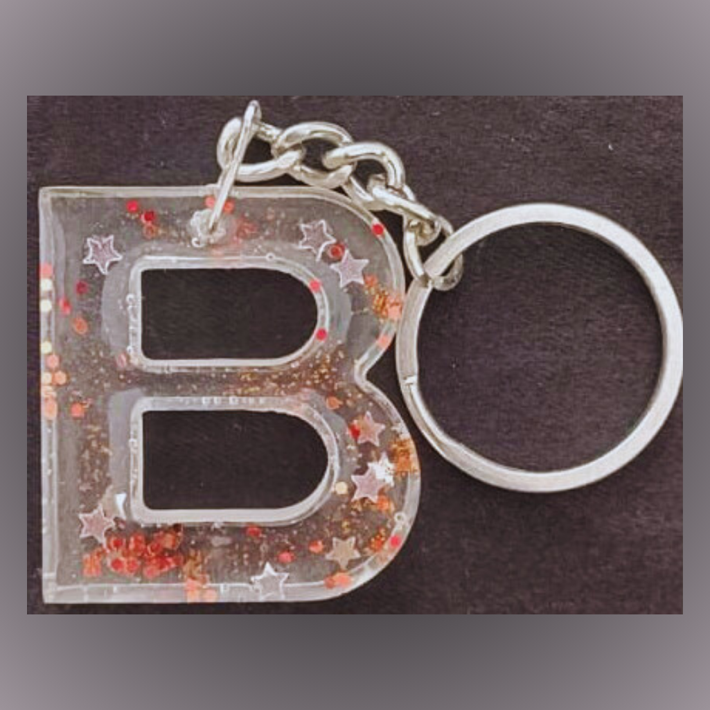 This stylish keychain features a bold, transparent resin letter "B" filled with shimmering glitter, red confetti, and silver star accents. Lightweight yet eye-catching, it's a fun and personalized accessory for keys, bags, or gifts.