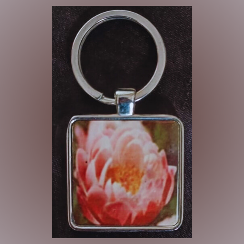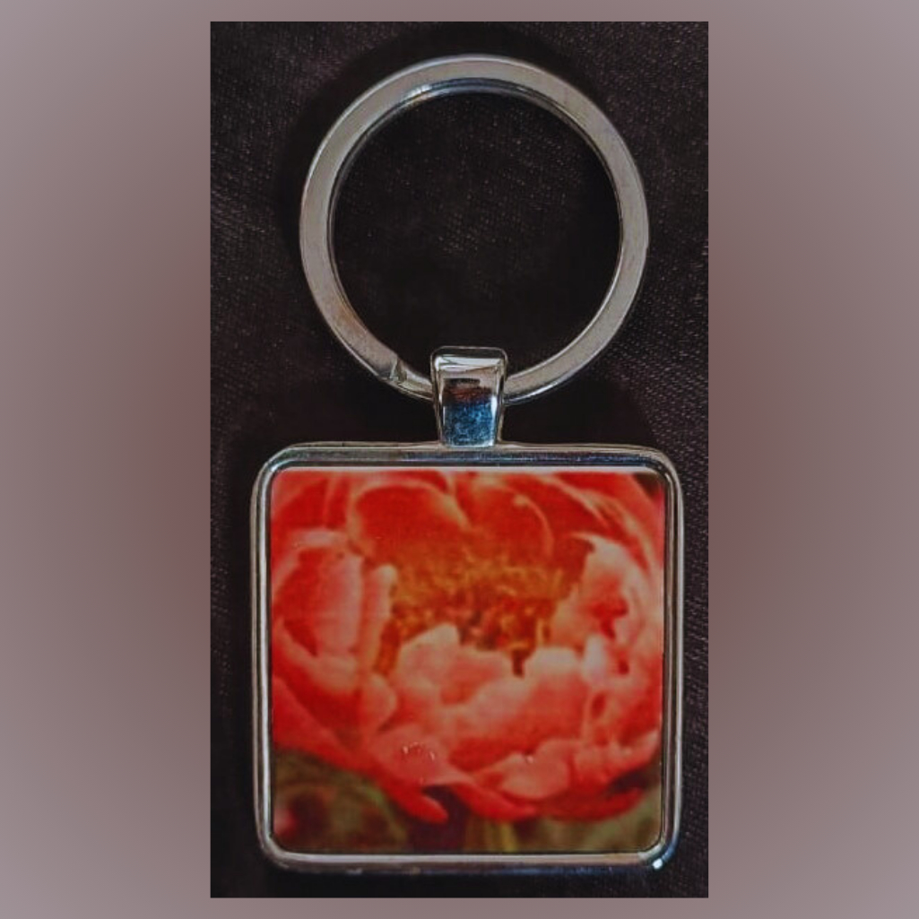 This elegant metal keychain features a square frame with vibrant rose designs on both sides. One side showcases a soft pink rose with delicate yellow accents at its center, while the other displays a richer, deeper-toned rose in warm red and orange hues. Crafted with a glossy finish and sturdy metal loop, it combines beauty and durability—making it a charming and functional accessory.