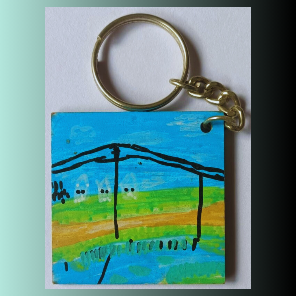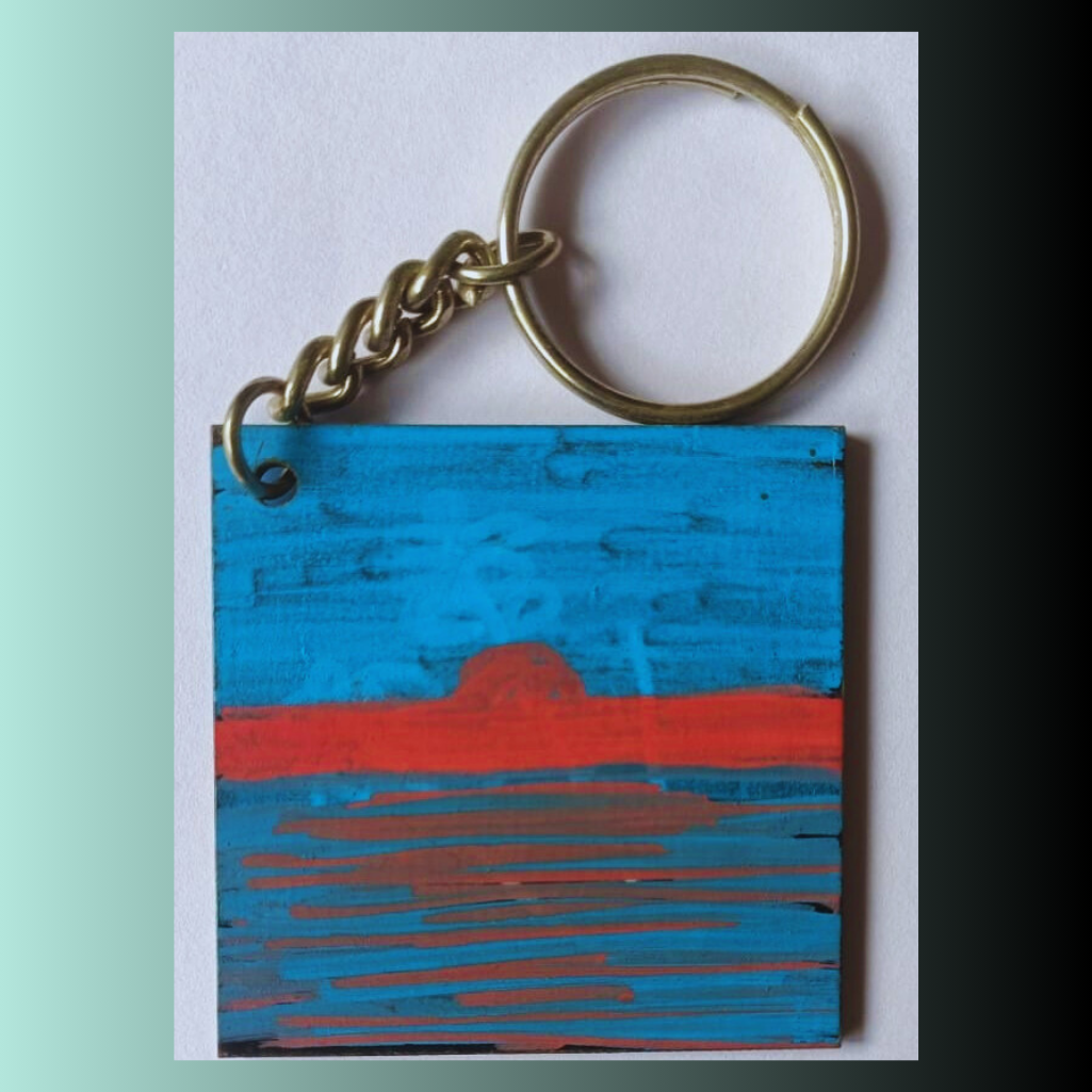 This handcrafted wooden keychain features two beautifully painted scenes on either side. One side captures a vivid sunset over calm waters, blending rich reds and deep blues, while the other depicts a peaceful countryside landscape with rolling green fields, a winding path, and quaint houses beneath a bright blue sky. Compact and artistic, this double-sided keychain brings a touch of natureโs charm to your everyday carry.
