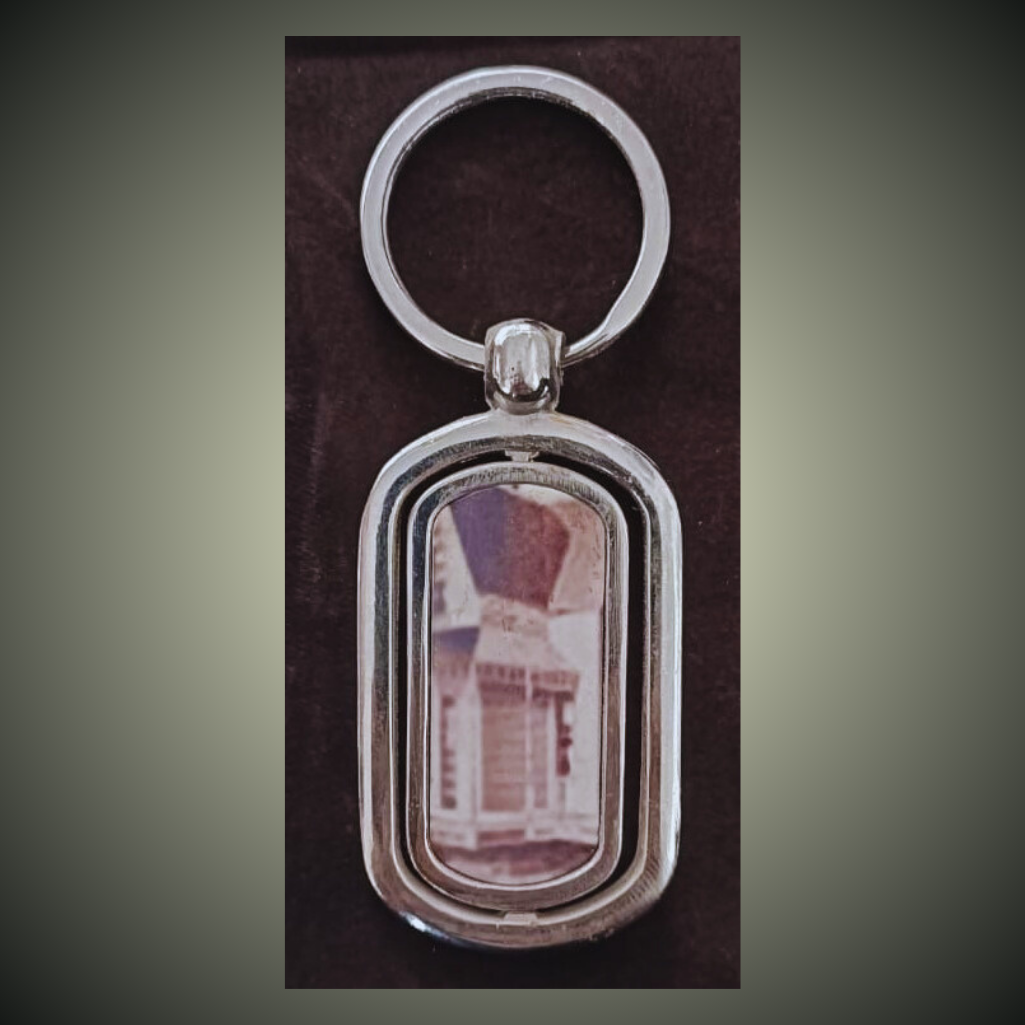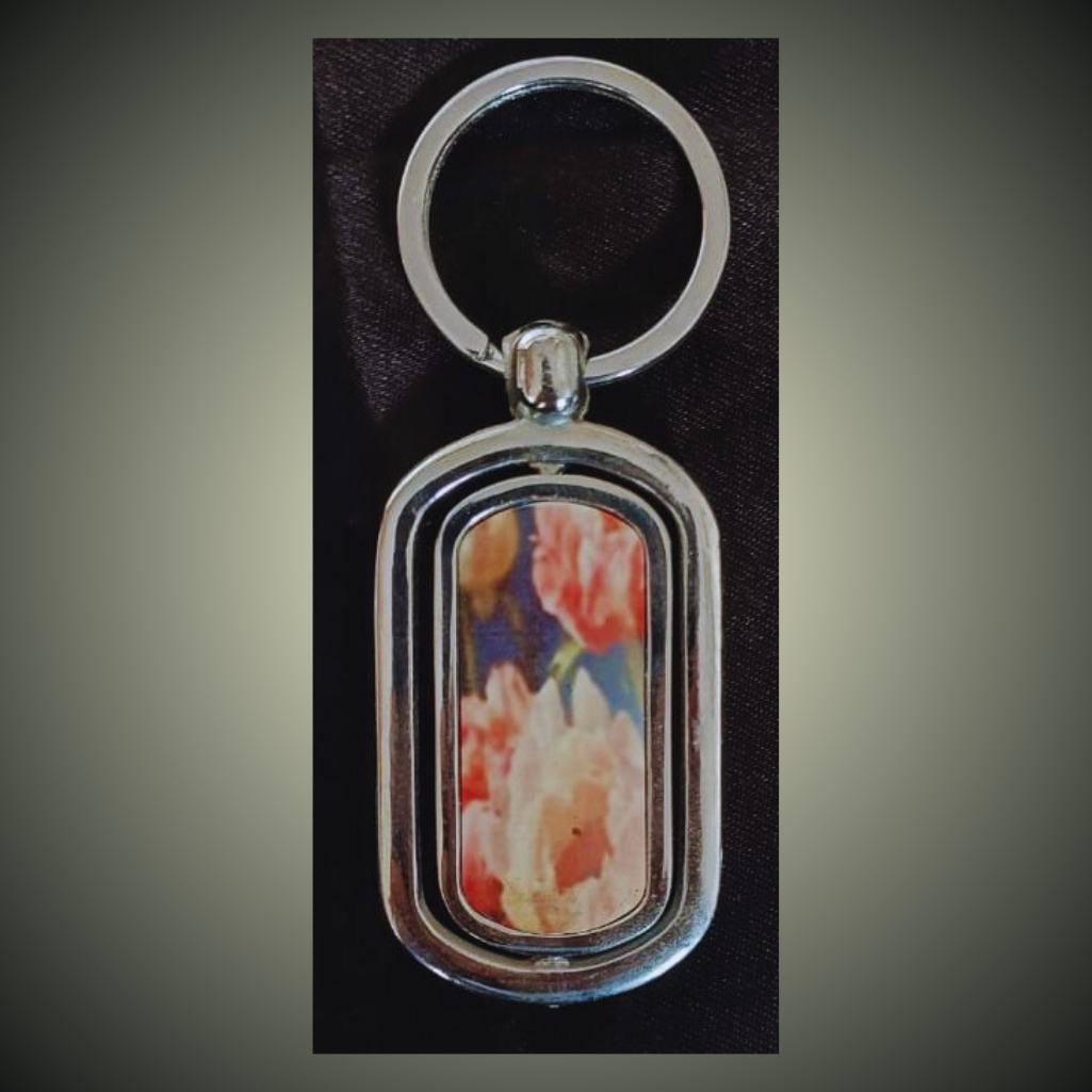 This oval-edged rectangular keychain highlights two contrasting yet graceful visuals. One side captures a beautiful image of blooming pastel flowers, while the other side presents an architectural view of a temple. A unique combination of nature and culture in one accessory.