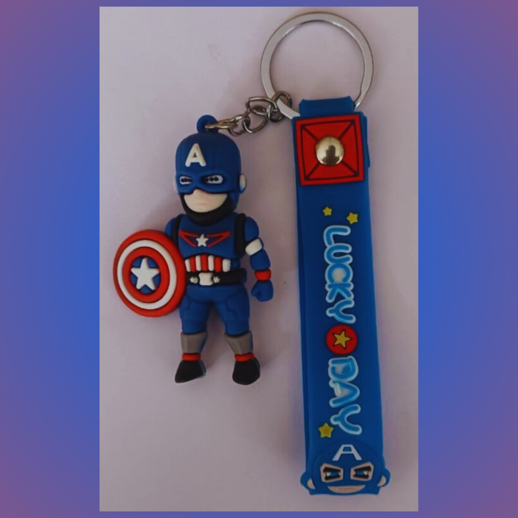 This vibrant keychain features a 3D rubber figure of Captain America, complete with his iconic blue suit, shield, and signature "A" helmet. Attached to the keyring is a bright blue silicone strap decorated with playful designs, including the phrase "LUCKY DAY," yellow stars, a red star emblem, and a cartoon-style Captain America face at the bottom. Durable and eye-catching, this keychain is a fun and heroic accessory for any Marvel fan.