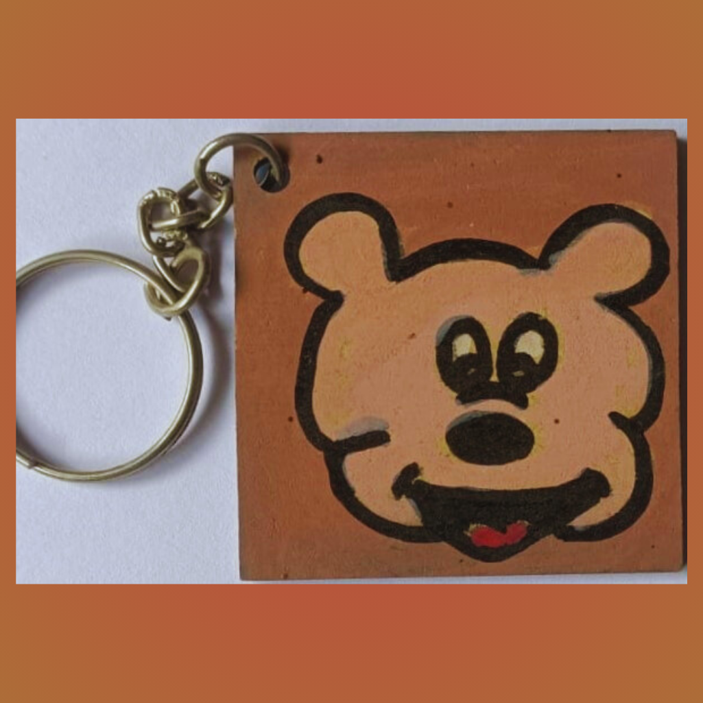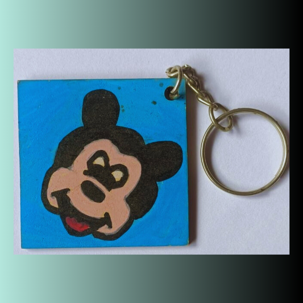 This square wooden keychain features playful cartoon character faces on both sides. One side showcases a cheerful bear with rounded ears and a wide smile on a warm brown background, while the other side displays a fun depiction of a mouse character with large ears and a grinning expression on a bright blue background. Its hand-painted charm and sturdy metal ring make it both a functional and whimsical accessory.