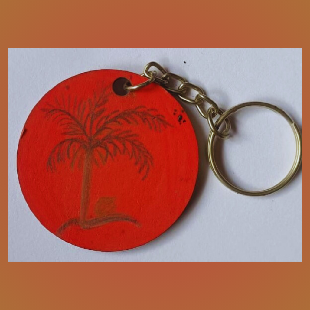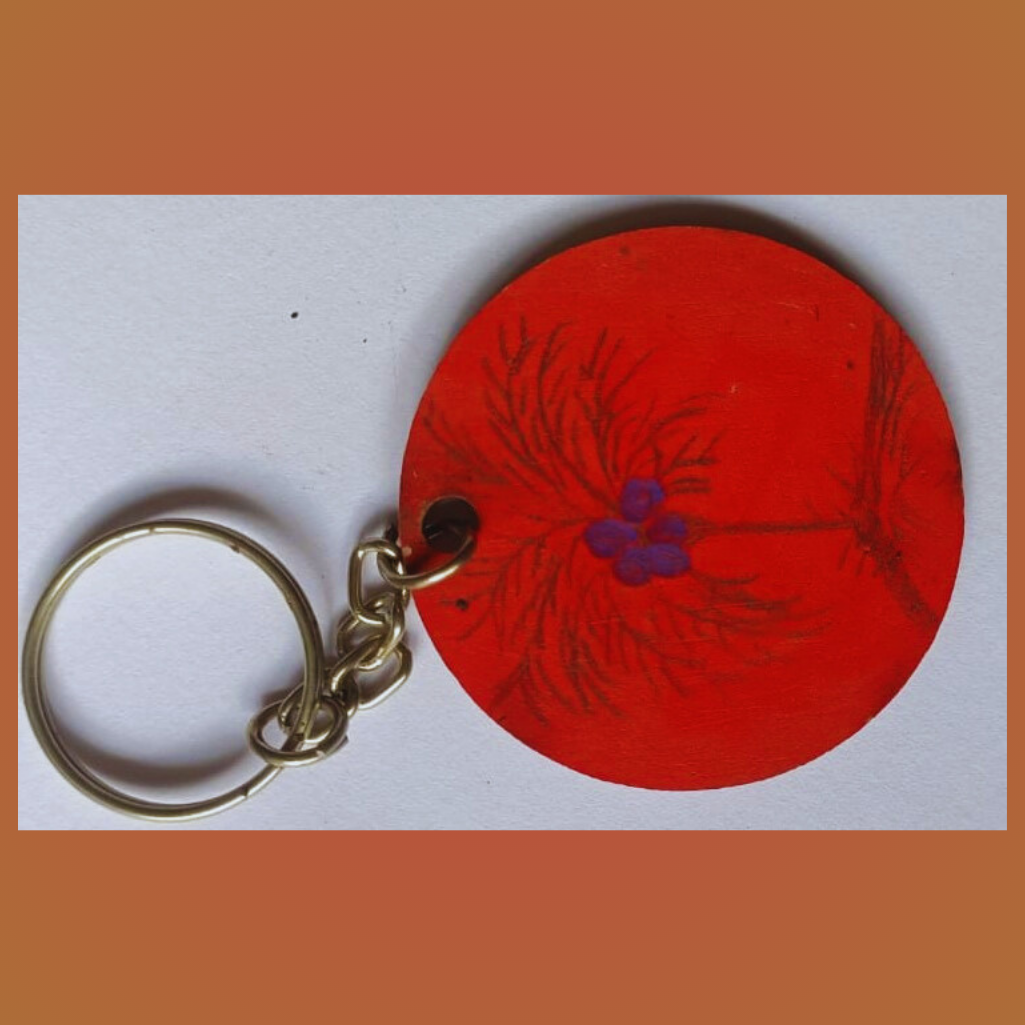 This handcrafted round wooden keychain features a vibrant red background with nature-inspired artwork on both sides. One side displays a detailed palm tree, while the other showcases delicate pine-like branches adorned with a cluster of small purple flowers, making it a unique and artistic accessory.
