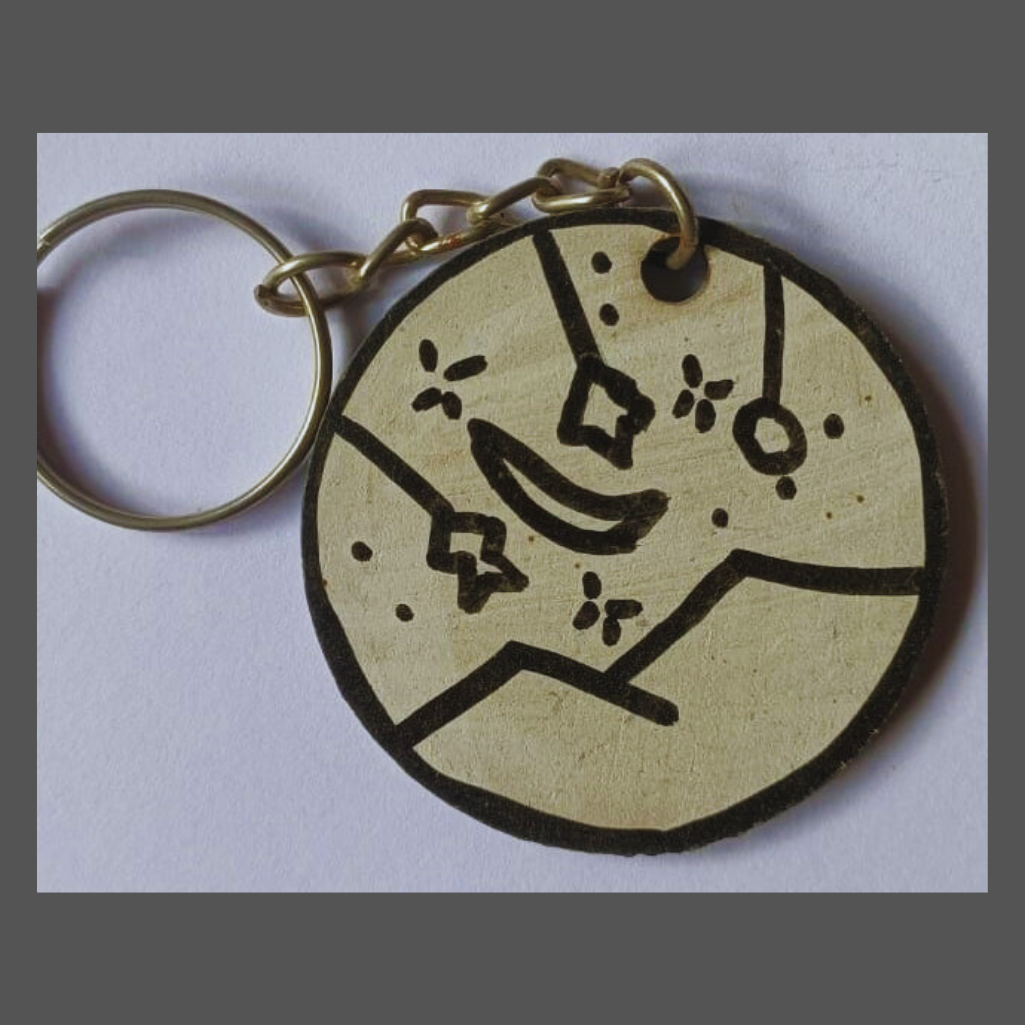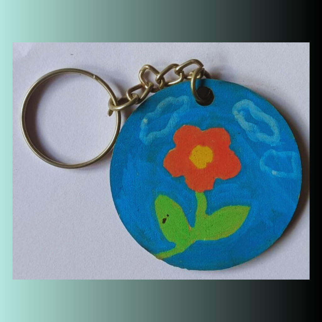 This round wooden keychain showcases a charming blend of artistry on both sides. One side is hand-painted in bright colors, featuring a vivid orange flower with green leaves set against a blue background, with soft cloud-like shapes adding a cheerful, nature-inspired feel. The reverse side contrasts this with a minimalist, monochrome design drawn in black on the natural wood surface, depicting abstract shapes including stars, dots, and a crescent, evoking a whimsical night sky or cosmic scene. The keychain is attached to a sturdy metal ring, making it both functional and decorative.