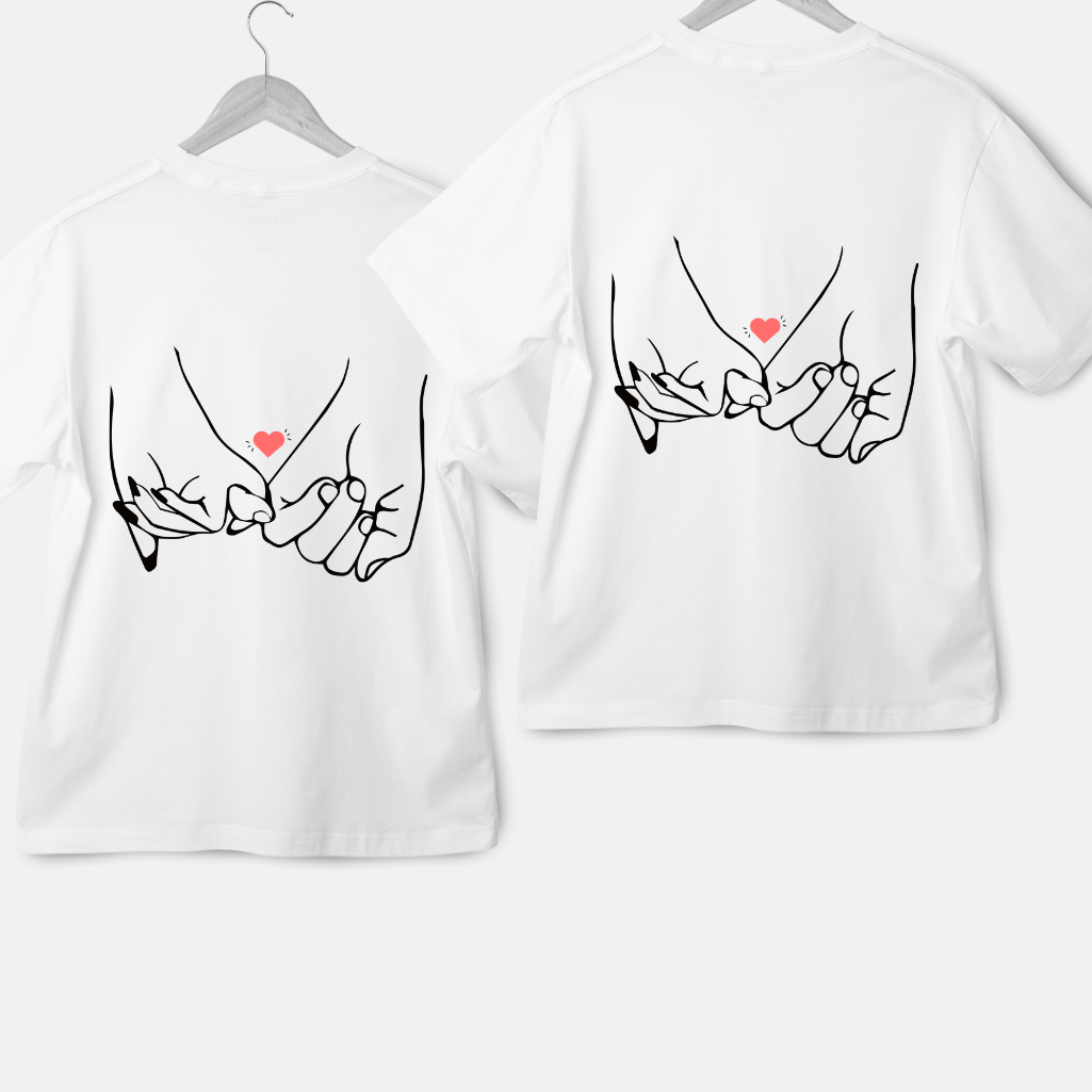 - Features clean line-art of interlocked pinky fingers or bold type with subtle heart accents