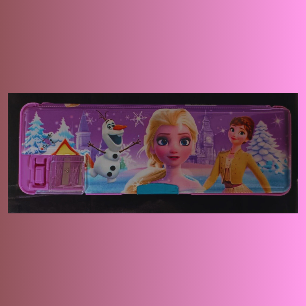 This charming pencil box š features beloved characters from Disney's Frozen, including Elsa, Anna, and Olaf āļøā. Set against a magical snowy backdrop with castles and twinkling stars, it's perfect for fans of the enchanted kingdom of Arendelle šš°. The exterior is a lovely shade of purple and pink šš, adding to its fairytale appeal. Inside, it offers ample space for organizing pencils, pens, and other stationery āļøšļø, along with an inbuilt sharpener and compartments for extra convenience. This pencil box makes school time a little more magical āØš!