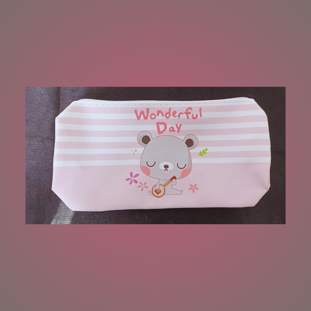 Let sweet melodies brighten your day with this soft pink pouch featuring an adorable bear playing a guitar, surrounded by flowers and the cheerful message “Wonderful Day.” 🌸🎸