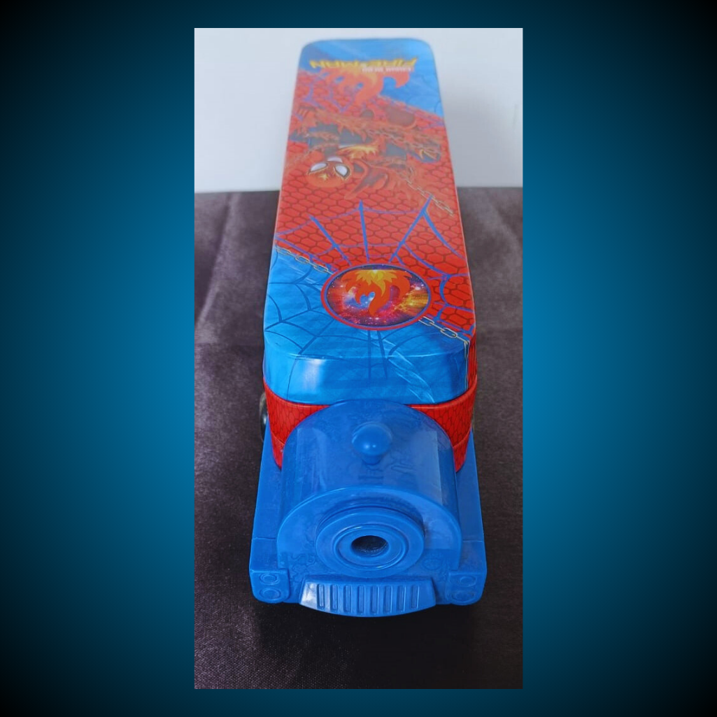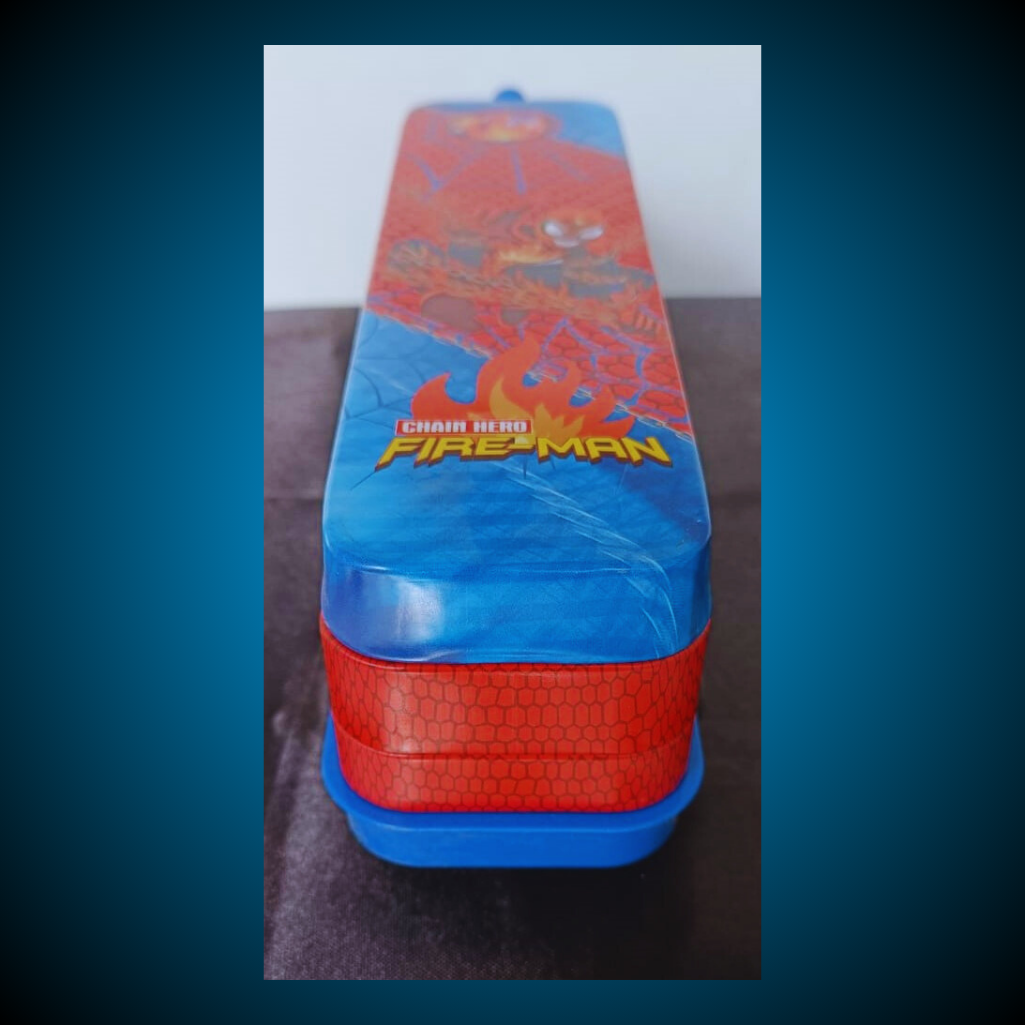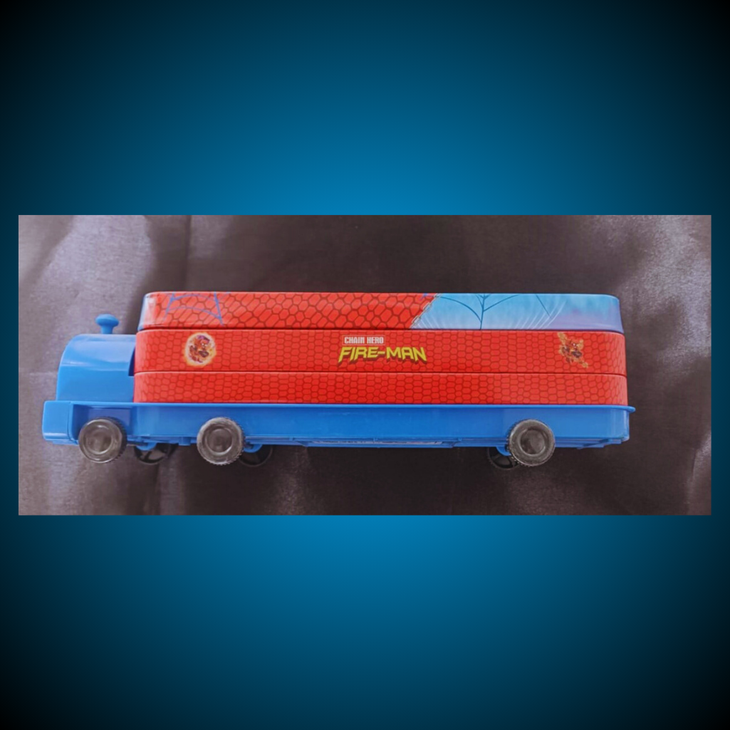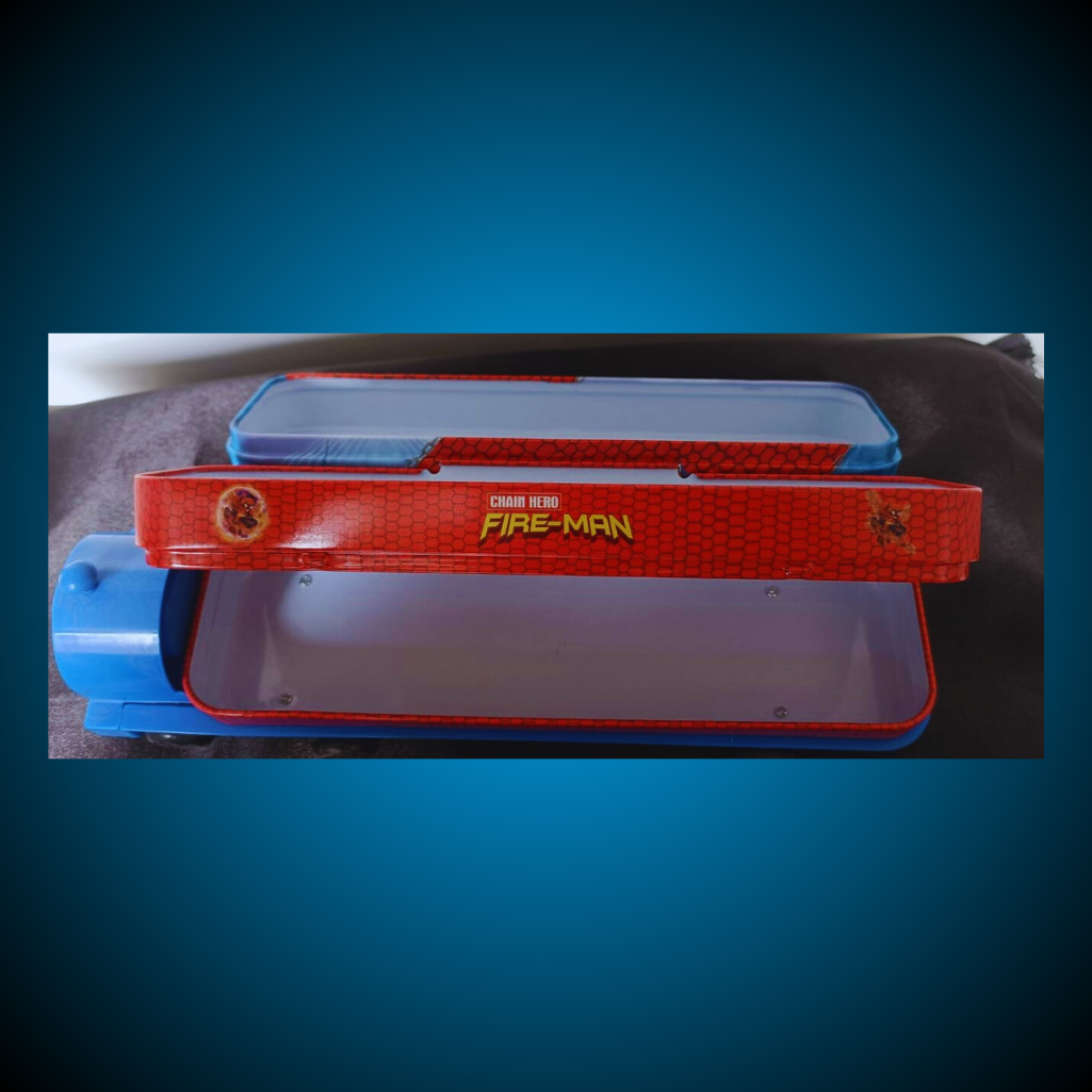This is a fun and colorful metal truck-shaped pencil box π»β¨ designed for kids who love superheroes and vehicles! The box features a bold red-and-blue color scheme with web patterns, inspired by comic book heroes. Labeled as "Chain Hero FIRE-MAN" π₯π¦ΈβοΈ, it brings a playful mashup of superhero themes. Made of sturdy metal, it includes two compartments for holding pens, pencils, and other stationery items, and even has moving wheels π, turning it into a mini toy-truck! With detailed prints and creative design, this pencil box adds a touch of adventure to any school day ππ.