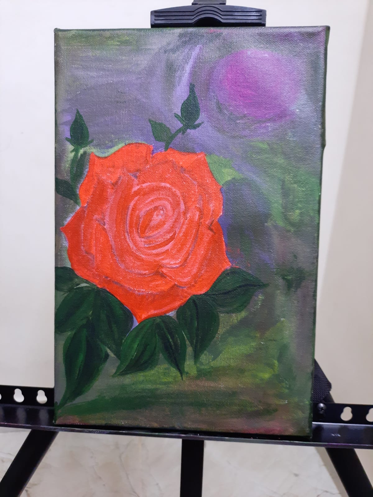 This striking painting features a deep crimson rose blooming boldly in the foreground, contrasted by an abstract background of swirling purples and mossy greens. A hazy violet orb—resembling a moon or distant bloom—hovers in the top-right, lending the piece an otherworldly, dreamlike feel.