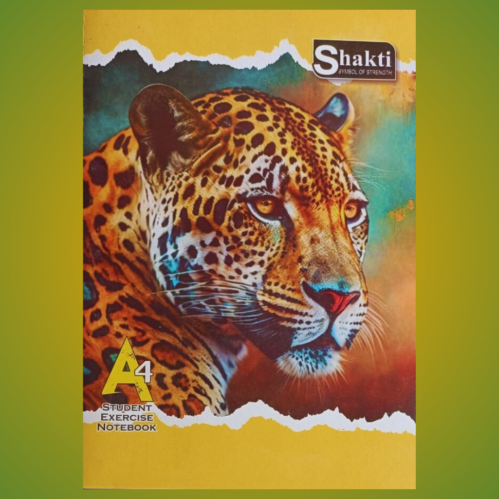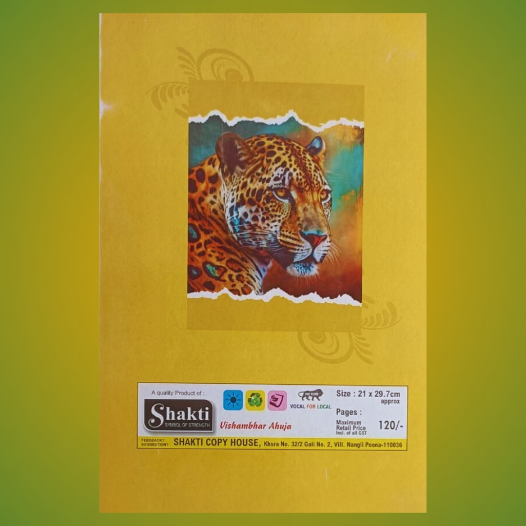 This is a high-quality A4 Student Exercise Notebook by Shakti Copy House. The cover features a striking image of a leopard, symbolizing strength and focus, with a bright yellow background. The notebook contains approx. 120 pages of ruled paper, ideal for school or college use. The inner pages are neatly lined with sections for date and page number, helping students stay organized. Made in India, this product supports the "Vocal for Local" initiative and combines durability with appealing design, making it perfect for everyday academic needs.