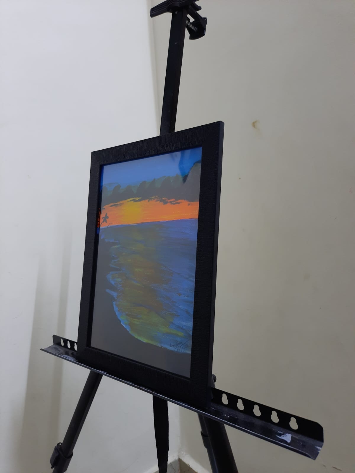 The brushwork suggests gentle motion in the waves and sky, evoking a sense of calm and the natural beauty of evening light. Displayed on an easel with a sleek black frame, this piece is ready for gifting or direct display.