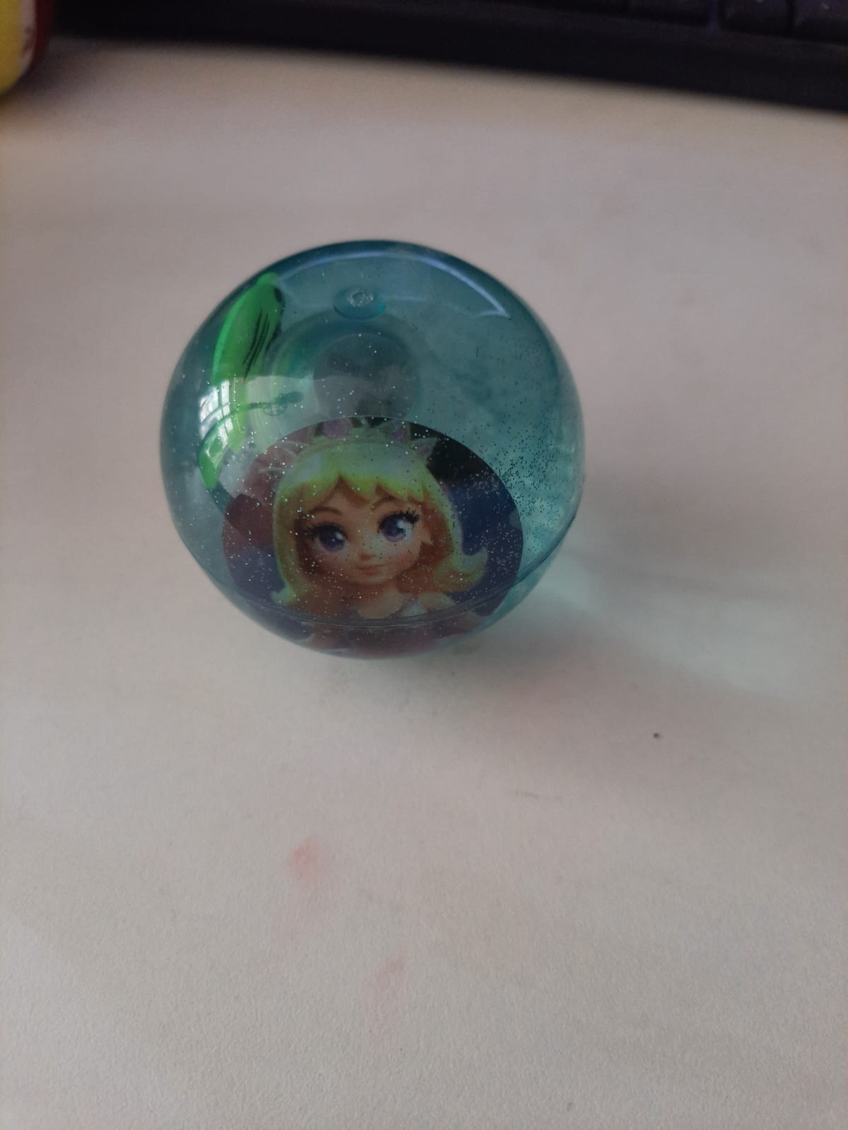 This is a โจtransparent blue bouncy ball๐ต with glitter inside โจ. It features a cute cartoon girl ๐ง with blonde hair ๐ and big blue eyes ๐, giving it a magical and playful vibe ๐. The ball looks glossy and smooth, perfect for a quick bounce game ๐ or just as a decorative toy ๐. It's sitting on a white surface ๐งผ near a keyboard โจ๏ธ.